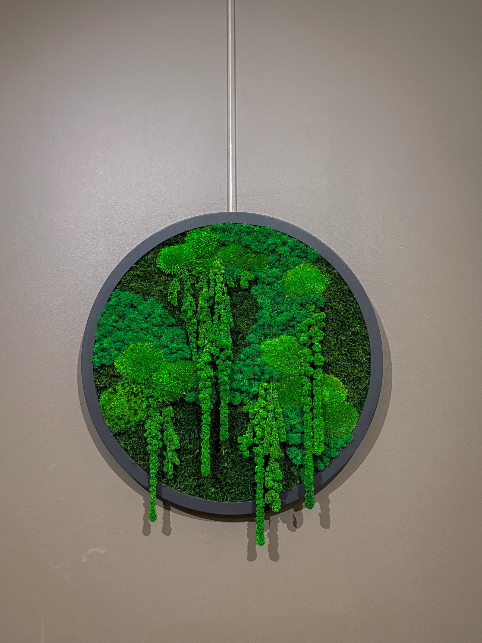 Šis 50 cm skersmens stabilizuotų samanų paveikslas yra išskirtinis meno kūrinys, sukurtas iš natūralių, įvairių atspalvių samanų, suteikiančių jam gyvumo ir unikalumo. Kruopščiai atrinktos tekstūros ir gylis sukuria natūralios gamtos fragmento įspūdį, tarsi žvilgtelėtumėte į miško peizažą. Tai ne tik interjero detalė, bet ir gyvas paveikslas, kuris kviečia namus pripildyti ramybės ir jaukumo.