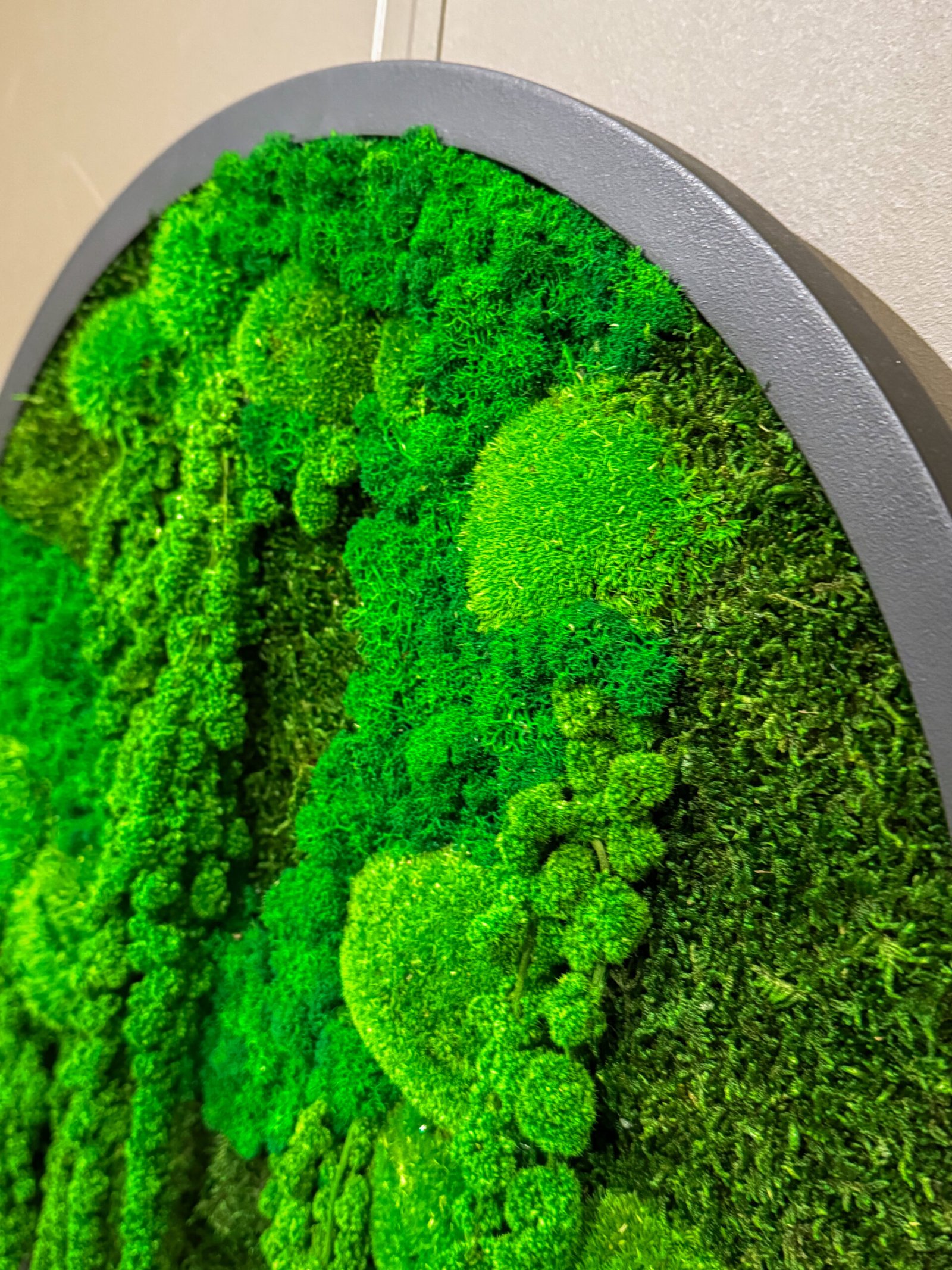 Stabilizuotos samanos nereikalauja priežiūros – jos išlaiko savo spalvą, formą ir minkštumą daugelį metų. Tokie samanų paveikslai puikiai tinka tiek moderniems, tiek klasikiniams interjerams, suteikdami sienoms natūralios žalumos akcentą be jokio papildomo darbo. Apvali forma leidžia šiam paveikslui harmoningai įsilieti į bet kokią erdvę – tiek pakabintą vieną, tiek kaip dalį didesnio sienos dekoro.